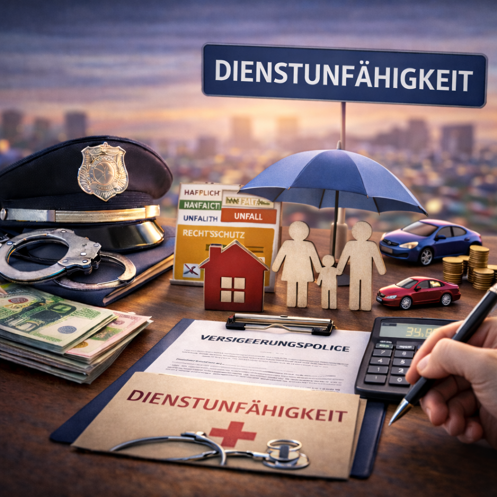 Aufgrund des erhöhten Gefährdungs- und Belastungspotenzials im Polizeidienst ist ein umfassender Versicherungsschutz erforderlich. Insbesondere die Absicherung gegen Dienstunfähigkeit sowie Unfall- und Krankenversicherung sind zentrale Bestandteile einer strukturierten Finanzplanung.